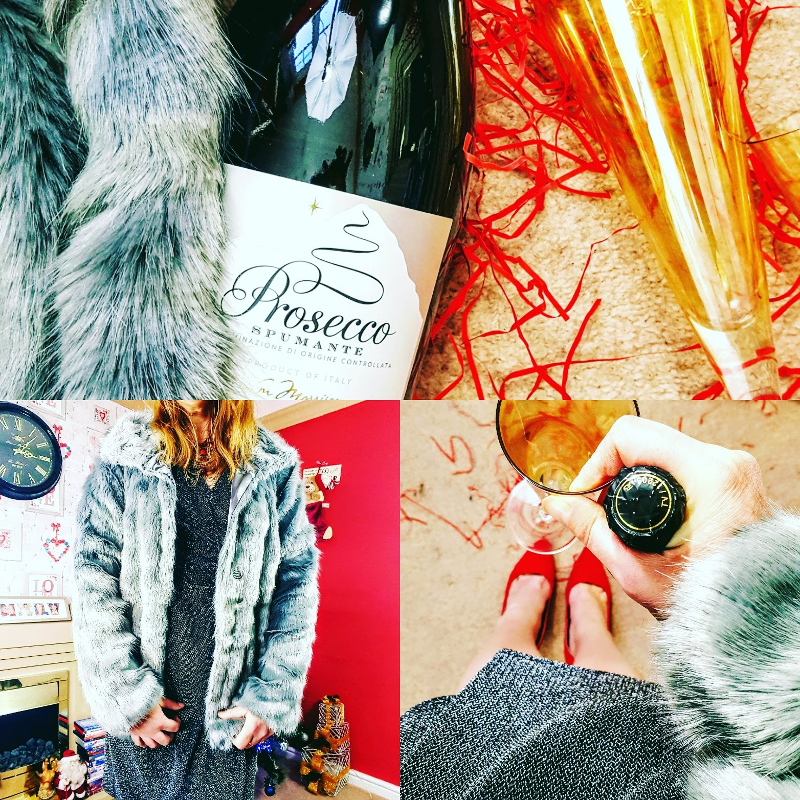 My beautiful Christmas box contains a sparkly Christmas dress, adorable grey faux fur jacket, prosecco, crisps, and chocolate. I have been really spoilt.