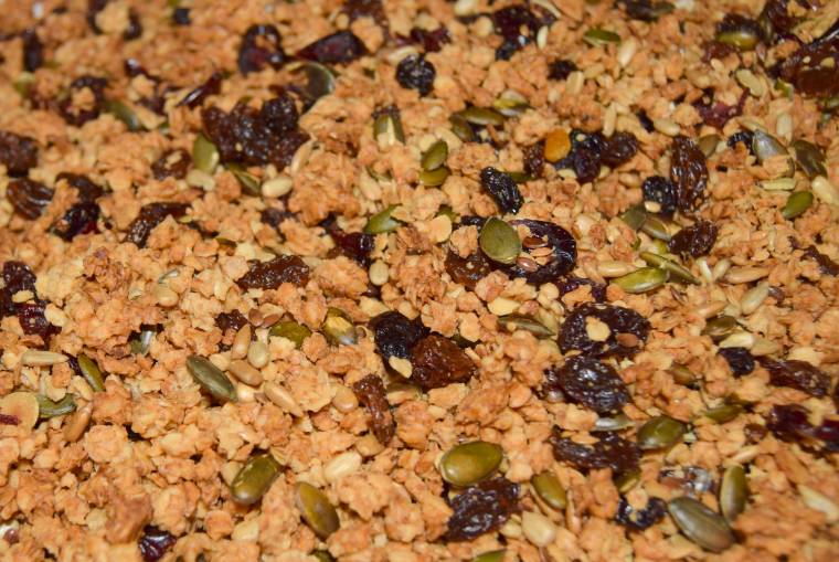 10 minutes before granola is cooked sprinkle the mixed seeds, raisins and dried cranberries on the granola mix around and put back into oven for the last 10 minutes.