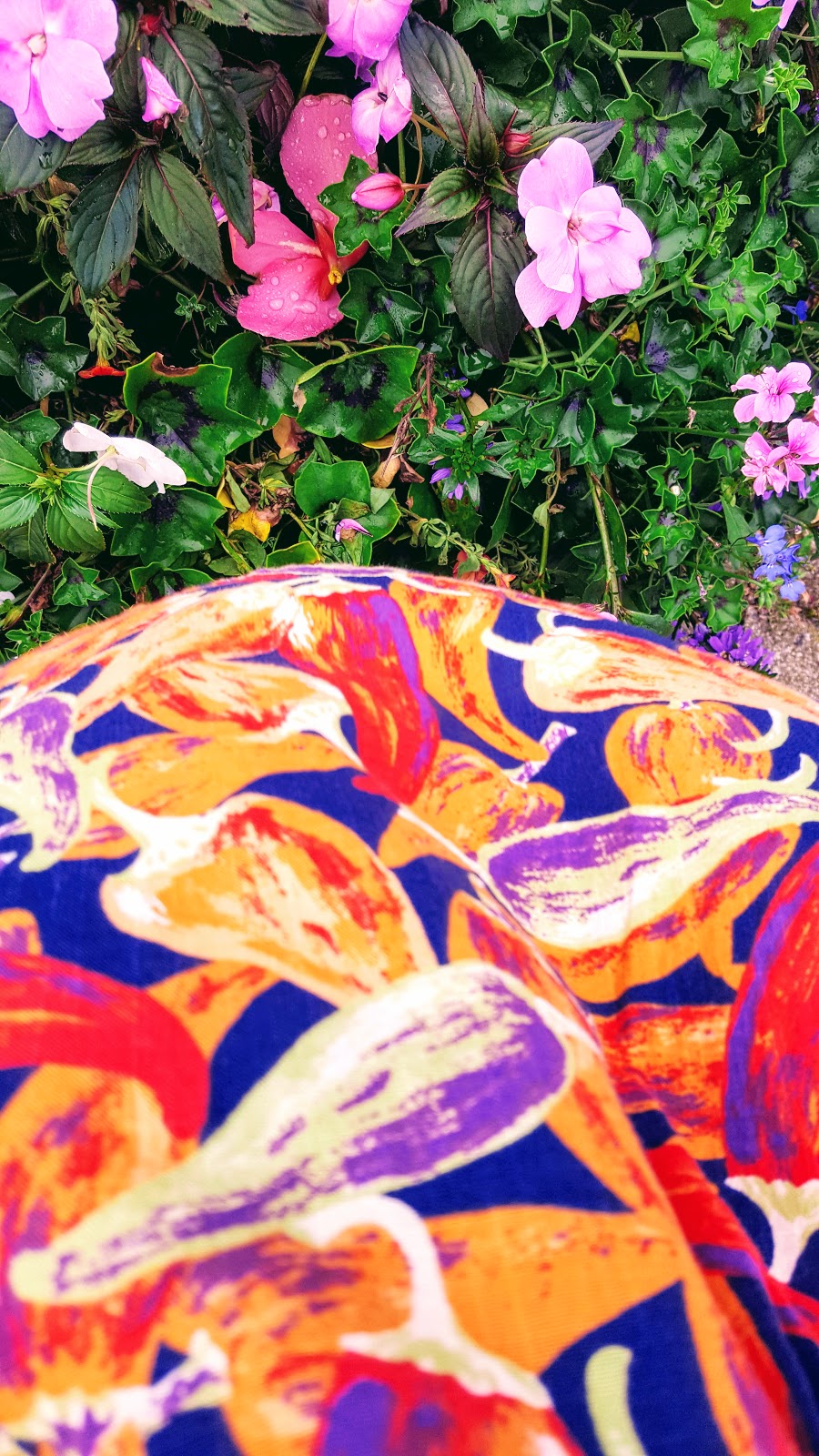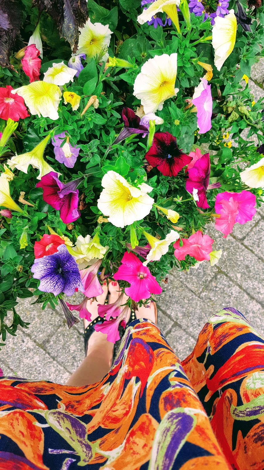 Chilies on my dress and flowers on the floor. Interesting combination.