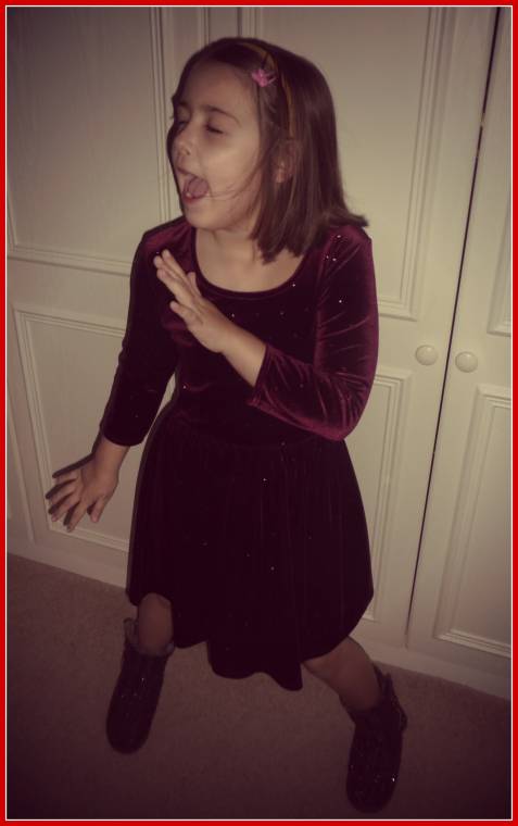 My daughter having fun posing in her new dress and boots.